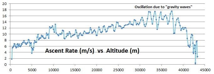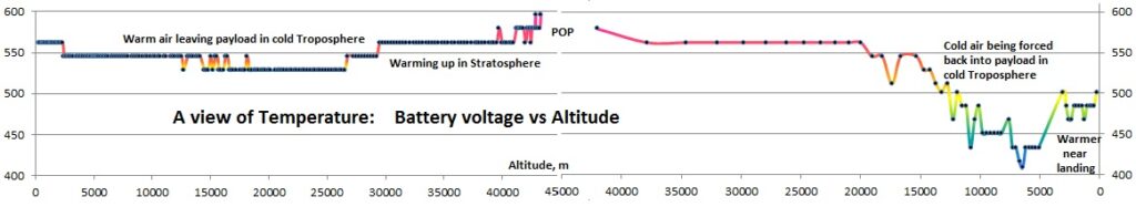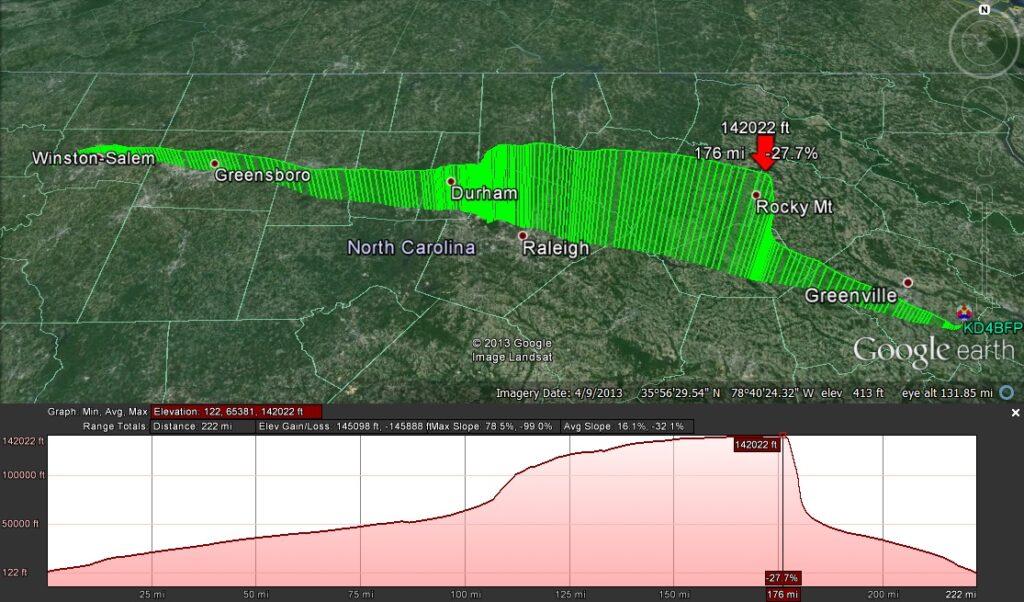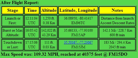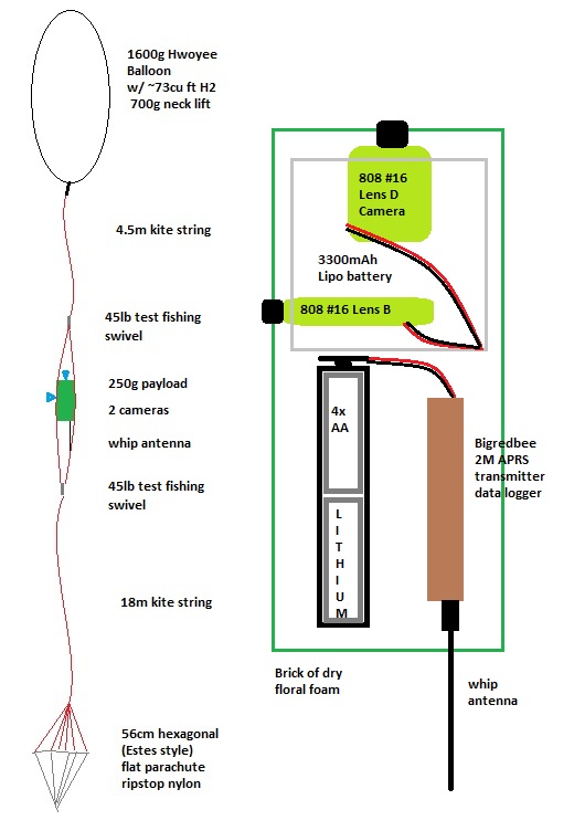 Details:  The payload was about 280g and consisted of a block of foam with a BigRedBee APRS transmitter/logger and two 808 #16 video cameras.  We used a 1600g cell and H2.  To prevent chute tangles with the popped balloon, we under-hung a homemade 56cm chute.  This allowed us to video the balloon on the way up and the ground on the way down.  It wasn’t a very attractive payload, and the foam was a mess to deal with, but it weighed practically nothing.