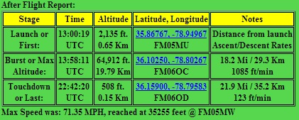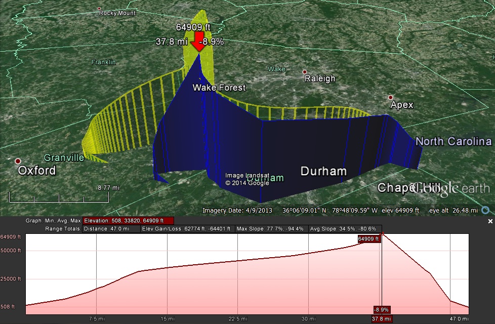 Launched 19 April 2014. Recovered 21 April 2014 from the NC State Experimental Beef Farm in Butner, NC. Max altitude: 65,088 ft @ 10:58 EDT (Data from onboard GPS logger)