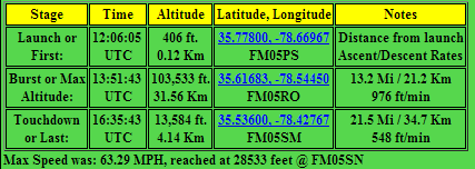 The AP510 Tracker with uBlox mod still needs some work. It worked really well up until about 38K ft, then it started acting strangely. We were ready for the possibility that the reported altitude could abruptly max out, but we then started seeing some really strange errors in Lat & Long as well. The unit then went completely silent for 40 minutes. Once the payload dropped back below 38K, it worked great again. We are working directly with the designer and we hope to try again soon with new firmware. This unit could become an inexpensive, feature-rich box for the HAB community. AND it speaks Bluetooth and is a TNC. Lots of cool project ideas come to mind.
