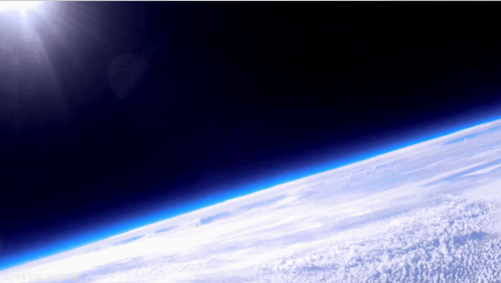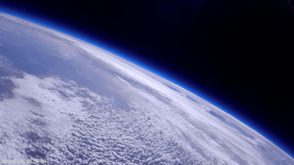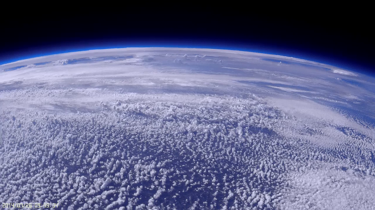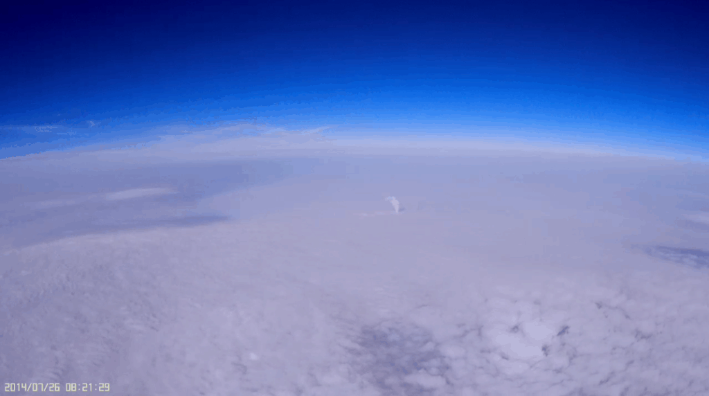 The floppy antenna: Stills from video 15mins apart. Paul noticed that his simple APRS antenna was showing up in the view of many of his lower cameras, so he set up this view just to catch the antenna in the act. It’s a simple steel wire with a black plastic coating. This happened between 25k-35k ft and the antenna regained its, um…, rigidity again on the way back down while passing through the same altitudes. So does it do this because of the cold of the troposphere, or the heat from the sun? Sounds like we need to play with some dry ice again and a heat lamp.