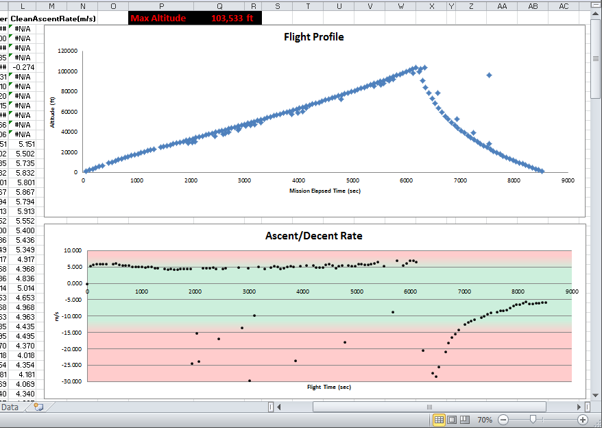 Again during this flight, we were able to take advantage of having both the projected plot and the live plot both visible within Google Earth (remember to save your Habhub projections as a KML before flight). That’s going to be key to being able to catch a payload someday. Also the live updating Excel spreadsheet let us keep an eye on live ascent/descent rates. We didn’t see the drop in ascent rate before burst like we see on most flights, but it did start to show up on the on-board data that was sampling every 10 sec.