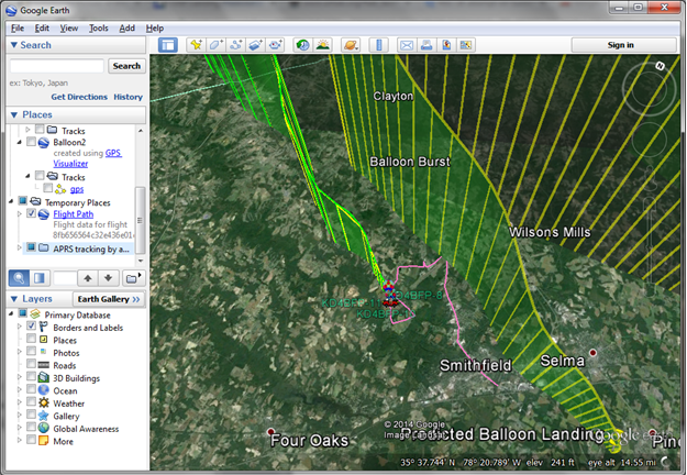 Screenshot of live plotting of Predicted (yellow) and Actual (green) flights as well as the chase team (pink). The small deviation off of the projected path was partially due to our last minute decision to increase lift gas. We were able to predict the landing zone to within 2 miles just after burst.