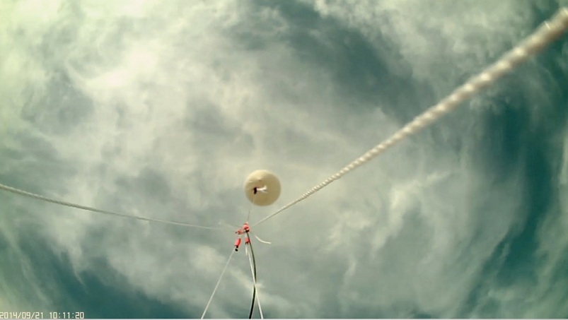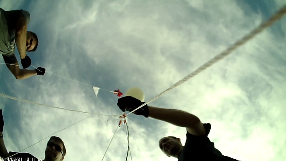 Note the water bottle dangling from the balloon; this is a common rig to estimate the desired ‘neck lift’ so that the balloon ascends at a particular desired rate (in this case 956g neck lift for a 685g payload mass).