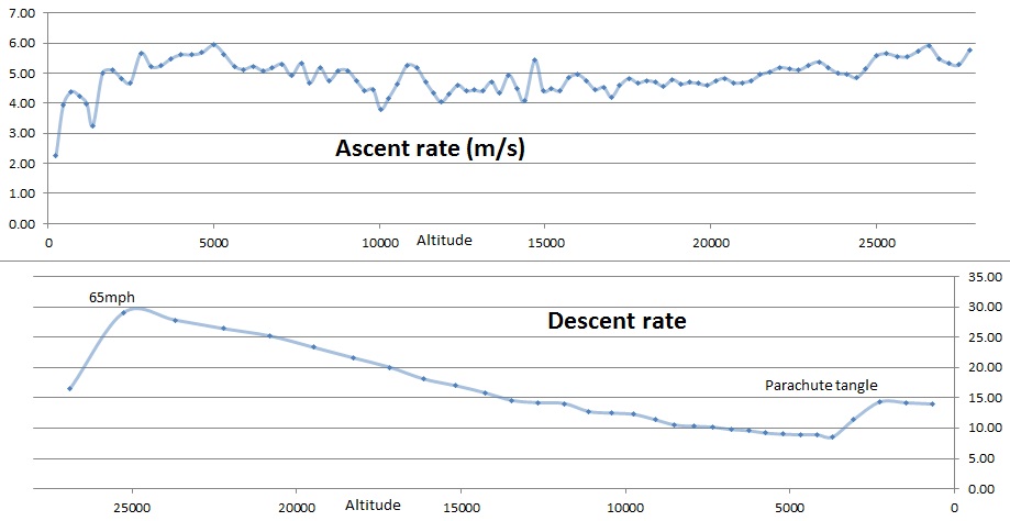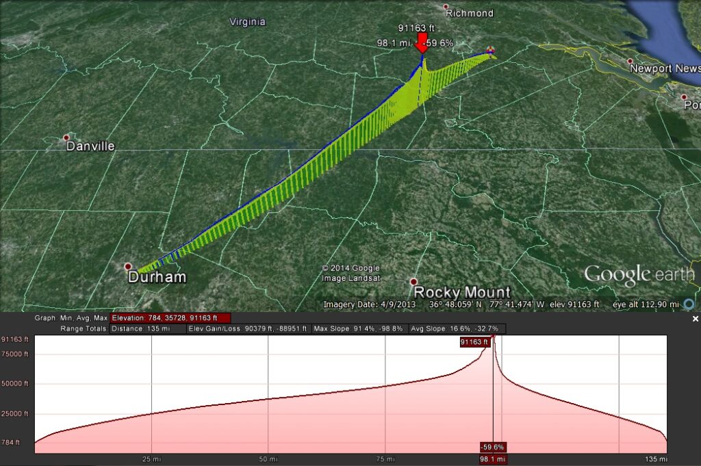 The jet stream decided to visit us for this flight, so we had a nice LONG flight and it traveled over 100mph for much of the trip. At one point it’s ground speed exceeded 131mph ! We believed that we were filling the balloon with 130 cu ft of Helium, but it appears to have been only 100 cu ft.