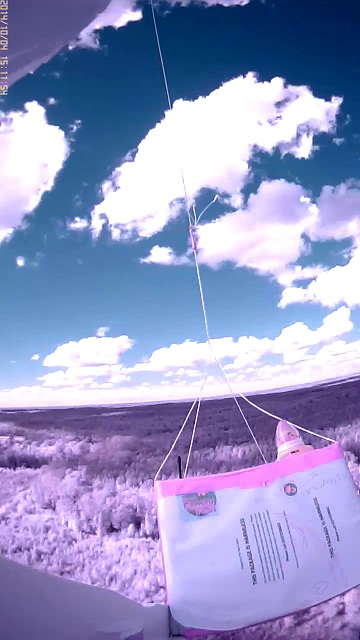 - 808 #16-D camera out on the tail. It has a wide angle lens and was mounted on its side and tipped up 45 degrees so that it could record from the payload all the way up to the balloon. And the IR filter was removed so that it could record more things in the IR range.