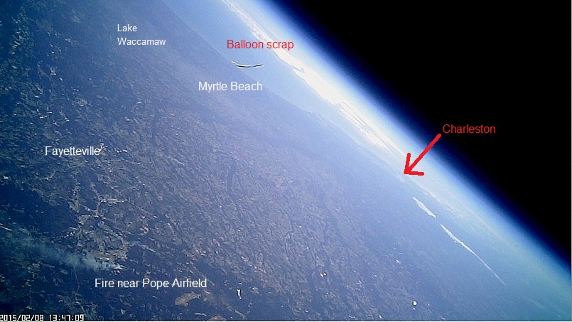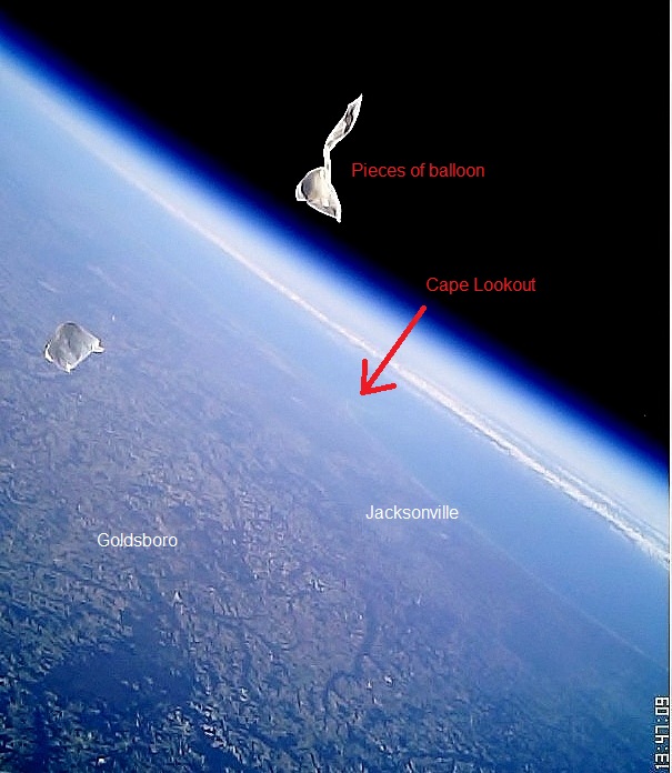 Although hazy, it was mostly cloudless, so we were treated to some great still images from the on-board video camera.  Here is the east coast of the US from 132,000 feet: