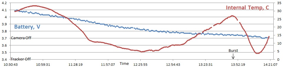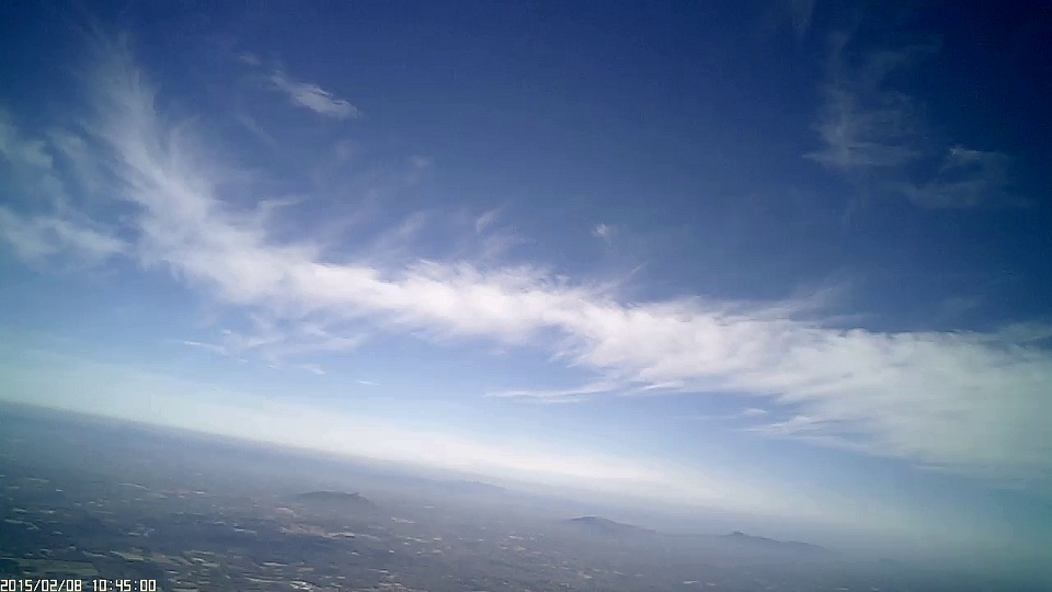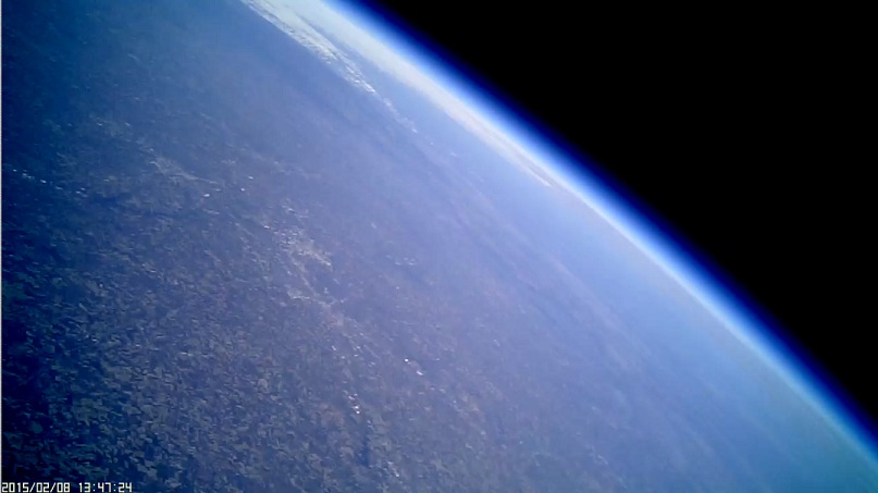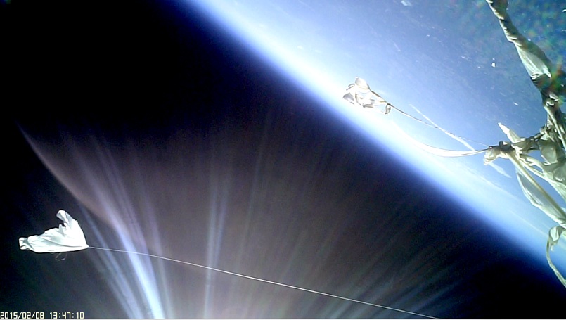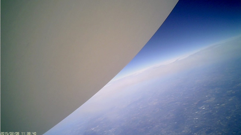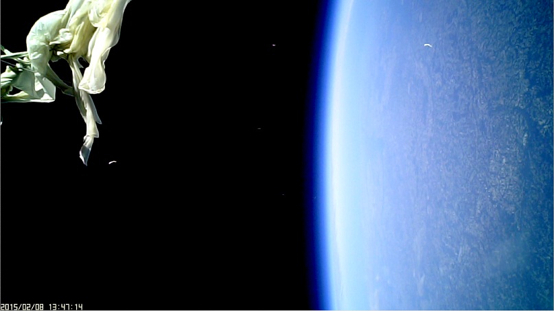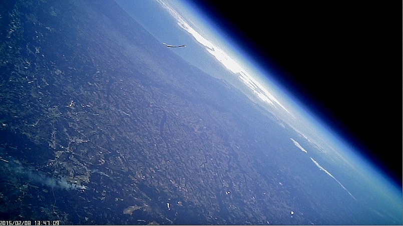On Sunday, Feb 8, 2015 we launched NSL-34.  This was another high altitude test and a re-flight of NSL-33.  The payload was identical to NSL-33 with the addition of a Spot tracker for backup.  The 275g payload (Spot, AP510 tracker with attached 808 #16b camera, under-hung chute) was lifted with a 1600g cell filled with Hydrogen to ~700g of lift.  The flight team consisted of Matthew(12) and Paul with Chris acting as Capcom / Public Affairs Officer.