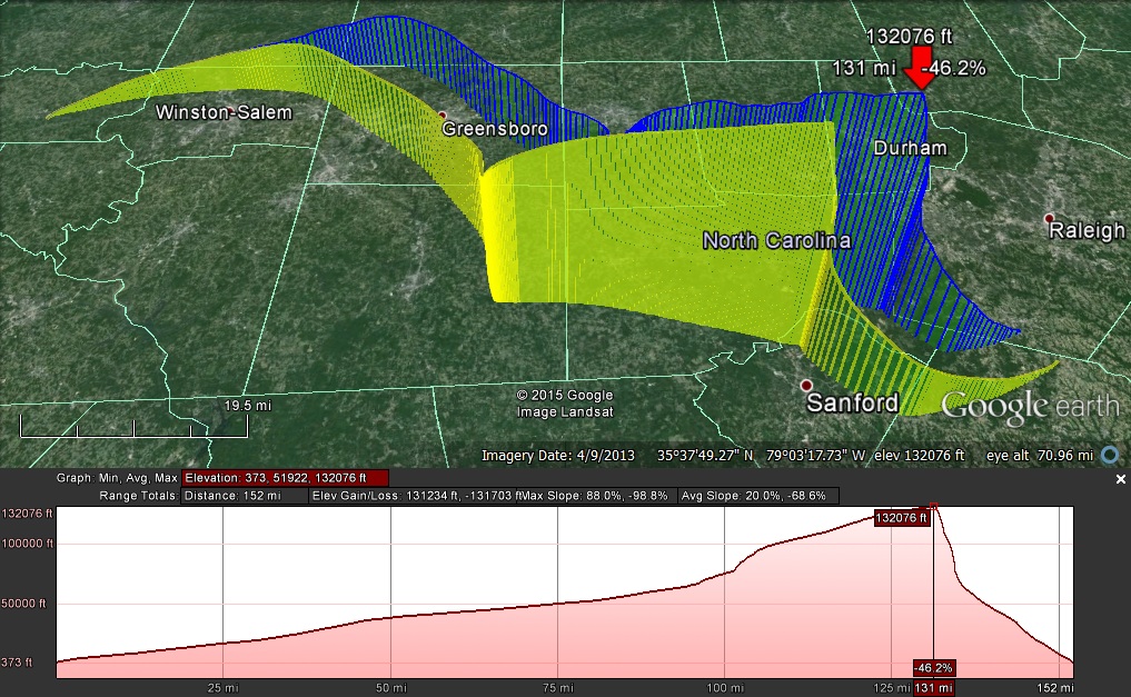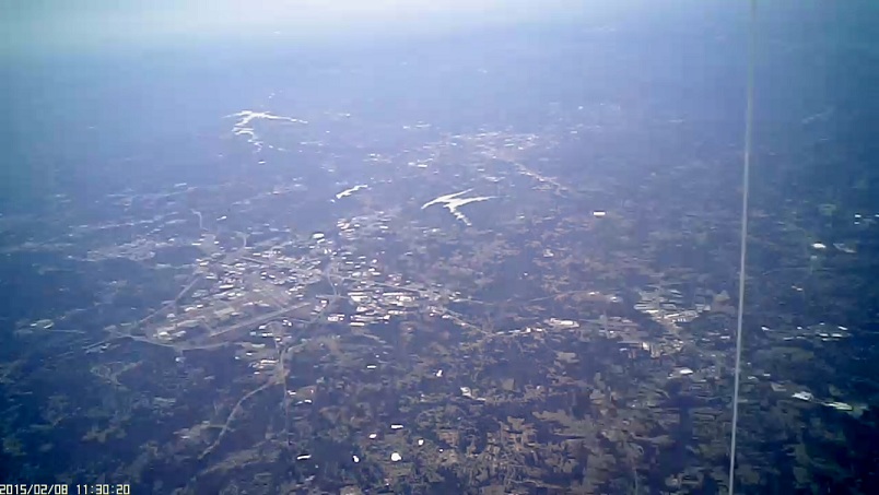 The predicted flight was to carry it north of Winston-Salem and then south to southern RTP.  It was a beautiful, sunny day for a chase, but it got a bit hazy up above.  Below are Pilot Mt and Hanging Rock State parks; followed by a view of Greensboro & High Point (PTI airport) as well as the string that led to the descent parachute 15m below.