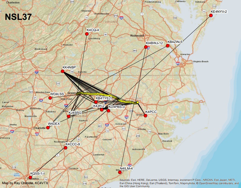 APRS reception plots courtesy of Ray KC4VTX.  These show some of the receiving stations for the telemetry packets during the flight. Although our two transmitters were ~1 Watt, they were easily received far away because of the high altitudes.