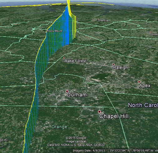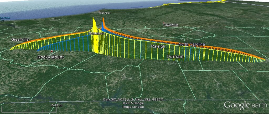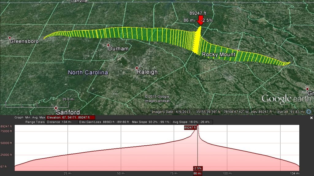 Actual flights (again blue and yellow) compared to the projected flight (orange) assuming a 12:00 launch.  The jet stream was dramatically swinging north during the day’s forecast, so the small difference in track between projection (orange) and NSL-38 (yellow) could mostly be accounted for by the 12:15 launch.