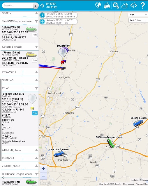 Recoveries of NSL-37 and NSL-38 by the student chase crews.   This flight, we tried the Habhub tracker, this allowed the chase cars to post their positions without needing amateur radio operators aboard.