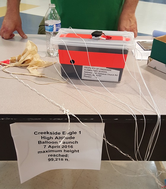 NSL-44 was launched the morning of April 6, 2016 from Creekside Elementary School in Durham, as part of their annual Science Week. Paul Thompson organized the event and also designed/built the payload. Paul Lowell acted as adviser and brought along the NCNS launch kit. Rich and Will, two of the parents, led the chase crew.