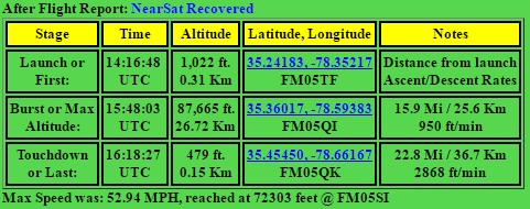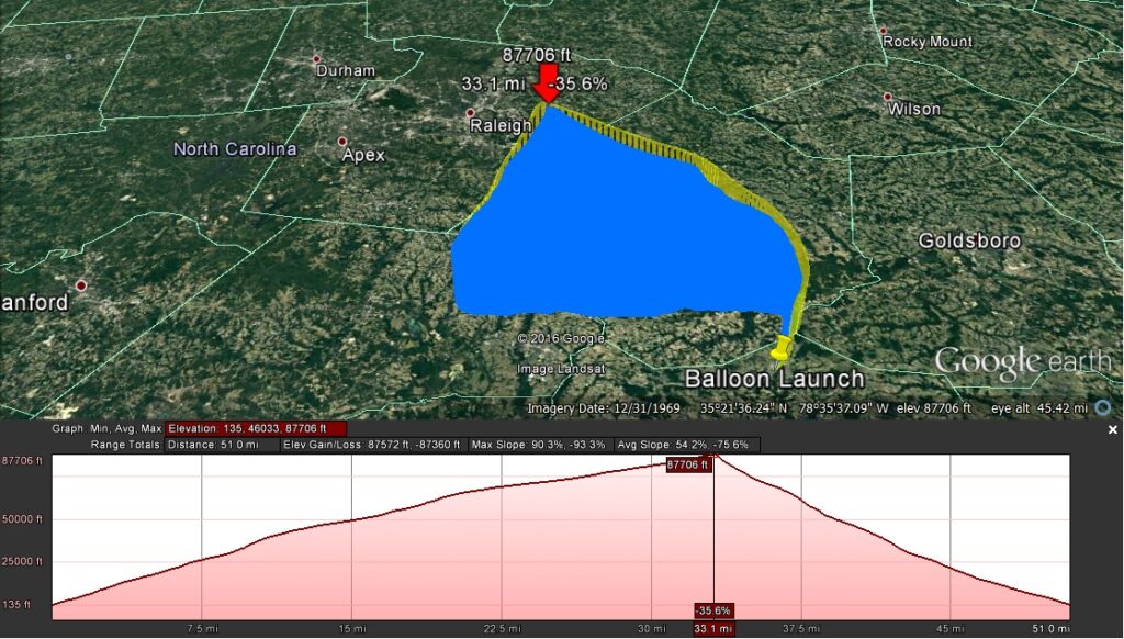 The launch/chase crew consisted of Chris, Ben and his daughter, Paul and two of his kids. Prep and launch went off without issue from a public park in Newton Grove, NC. The flight was very ‘nominal’ and it had a calm burst at 26,740m.