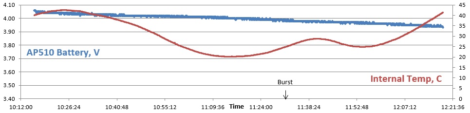 Periodically during the flight, I sent APRS messages from the chase car to the payload. I was using an iPhone app wired up to my Baofeng handy-talkie. My son just stuck the handy-talkie antenna out the car window. Eventually the payload heard my signal and responded as expected. Looking through the logs it appears that my iPhone app was sending malformed packets. It wasn’t until a repeater heard my transmissions and sent a clean copy that the payload actually responded. So I’ll need to work on my transmission rig. I can also rewrite my code to workaround the bug.
