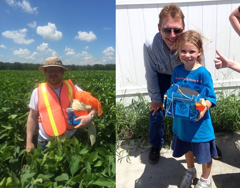 At burst, the majority of the balloon stayed intact and trailed above the chute. Thankfully it didn’t permanently foul the chute. Flight timing allowed for the all-important fast food stop and we were able to get under the payload at landing. One of the chase cars was able to stop and watch the payload descend into a field of soybeans. We lost Spot upon landing and APRS was only available locally, so we figured the payload had flipped over. Even though the parachute was bright orange, the chase crew had witnessed a lot of heavy balloon attached. Sure enough, both the payload an parachute were buried deep under the soybeans. It took over an hour to gain permission and walk the field to find the payload.
