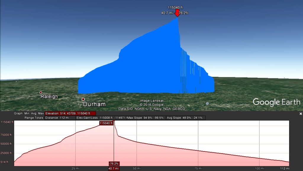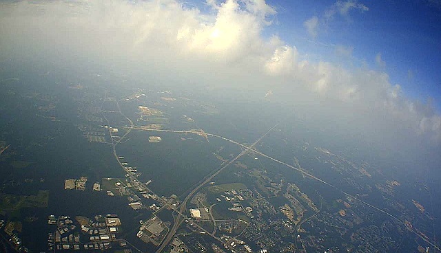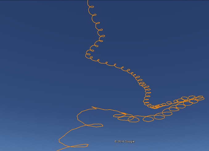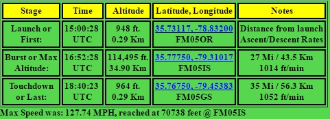 This long glide tested the patients of the chase crew. At a height of 21km, the glider began to stall; diving at 40m/s and then pulling up to a standstill. Sometimes even gaining altitude (position recorded every 5 sec). By 16km, it began to smoothly glide in 1km circles. At that height, it was only falling at 5m/s; as fast as a typical parachute payload at landing. Below 9km, the descent rate dropped to a very slow 2m/s ! It seemed to just hang above Siler City for an hour. Eventually it came to rest in a thicket of thorns on the edge of a field (recovery involved some nasty blood letting).