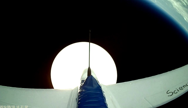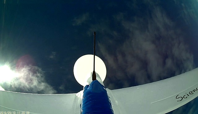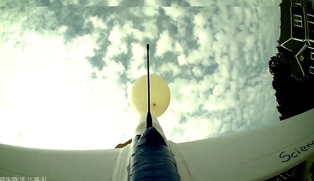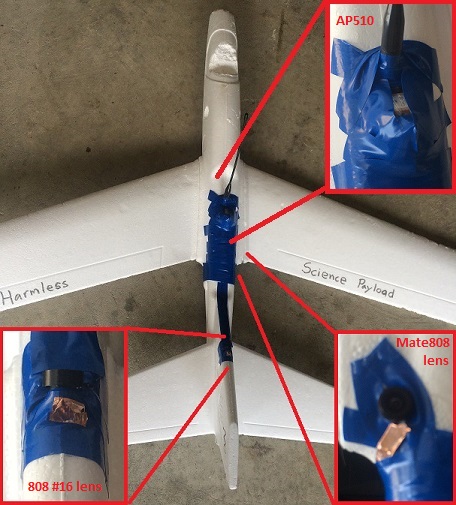 We took the NSL-47 glider and added an additional camera to it. A new ($25) Mate808 with an extended wide angle lens and its own 1000mAh battery was fitted into the fuselage. Its lens was cabled to the underside of the craft and oriented so that it would capture an upright image while ascending under the balloon. Like NSL-47, an 808 #16-D camera was mounted inside with its lens extended to the vertical stabilizer. Copper shielding was added to the lens cables to try to rule out noise issues.