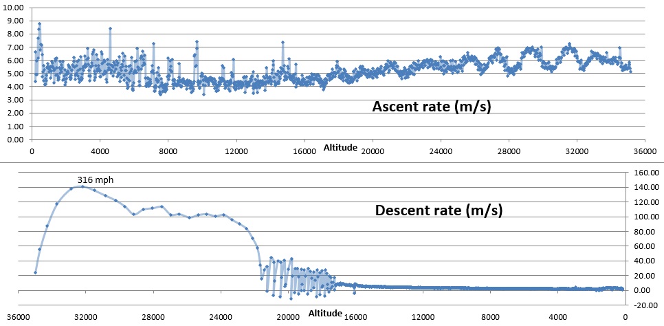 Ascent to 35km took 113 minutes. Even with an initial dive of over 140m/s, it took 108 minutes to land. This is by far the longest descent duration of any of our flights.