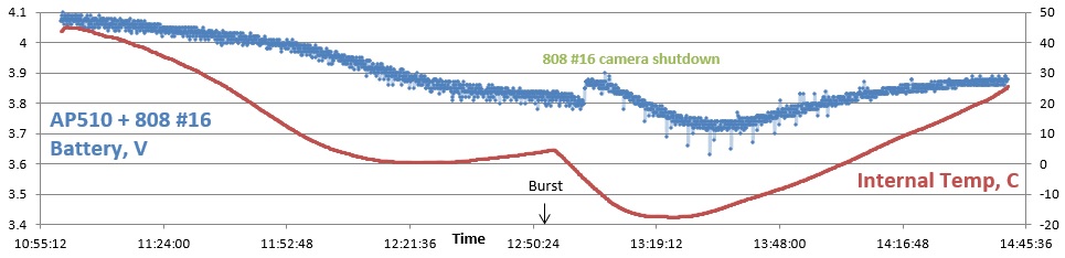 The 808 #16 was expected to provide video over the entire flight, but it shutdown as the glider plunged back to earth. The cold lowered the lipo voltage towards the 3.7V cutoff. After shutdown, without the camera’s additional heat, the electronics compartment got very cold. But without the camera’s current draw, the lipo voltage jumped up a bit.