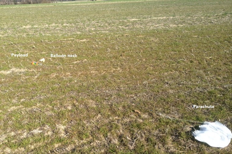The parachute was over-sized for the payload, so a hole was cut in it. The hole could have been even bigger as the descent rate fell to 2m/s at times.