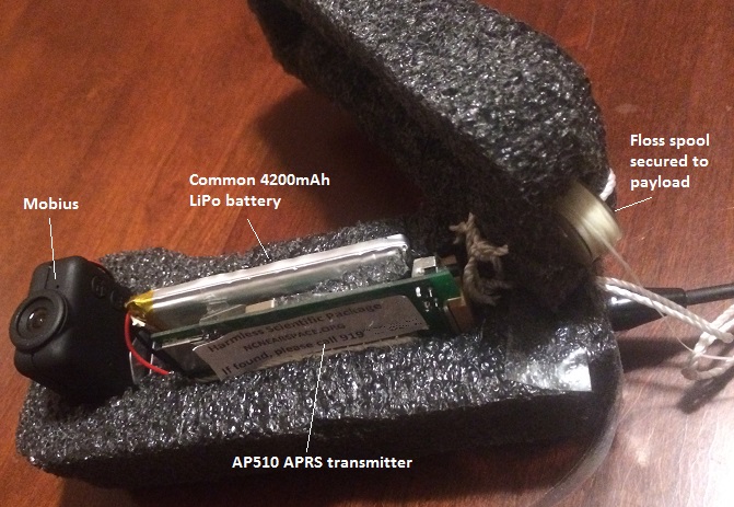 The payload for this flight was simply an AP510 tracker and a Mobius camera. Both were mounted in a clam shell of black foam and then secured with day-glow duct tape. It took about an hour for Paul L. to put it together [and he admits it looks like it]. The Mobius would provide reasonably nice images and allows for some tweaking of its sensor/algorithm to get the most out of it. The AP510 would be the APRS tracker and also monitor the battery and internal temperature. An under-hung parachute (see NSL-33) was added.
