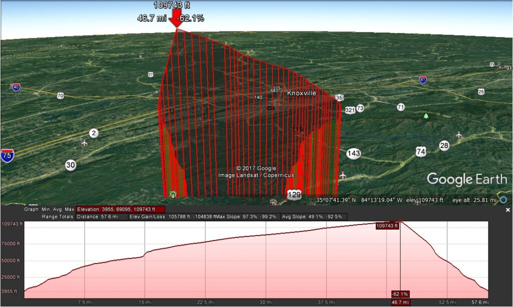 Paul’s family set up a command center (air-conditioned minivan) in the parking lot of the Mayfield Corn Maze just northeast of Athens, TN. This site was between the paths of longest totality on the ground and at 25km altitude. The area also provided plenty of nearby fields for recovery on the zigzag flight path.