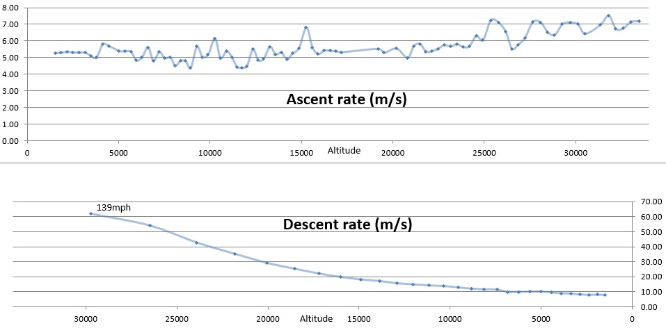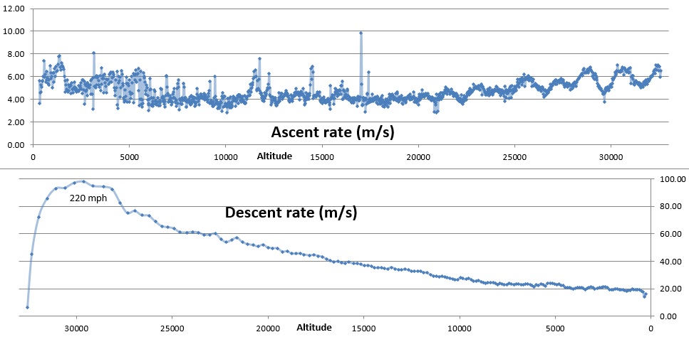 The ascent rate showed some nice gravity waves at altitude. The descent showed the payload falling at 4x the desired speed due to the fouling of the parachute.