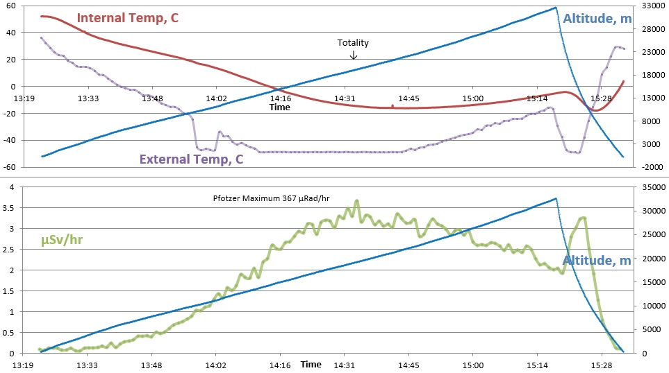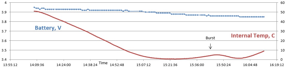 There was an interesting external temperature anomaly during ascent. This does not correlate to totality or anything else that we can figure at this time. We will continue to investigate. Perhaps the video can give us clues as to what was going on at this time. The external temperature probe cannot handle temperatures below -49C. This unit has never been this cold before, so it was interesting to see it bottom out.