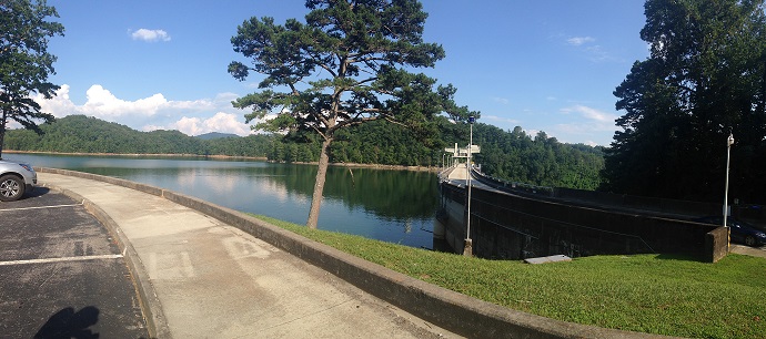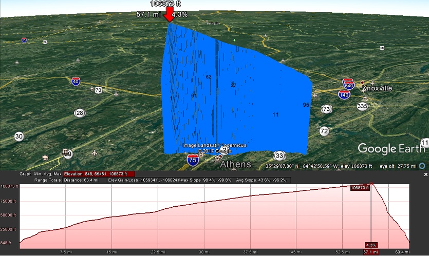 Chase team members Christopher and Justin took off westward from town to look for the thing and try to get under it with a radio. Last packet received was 4,905 ft. up over a valley containing the Apalachia and Hiwassee Lakes. Local elevation at Murphy is about 1,600 ft. The team orbited the area around the last known coordinates as best they could, but even given the limited roads visible on the map, a number of them were either private or nonexistent. Team tried to regroup at the top of a large TVA dam with a receiving antenna in the hopes that if it did come down in the valley, they would receive a signal, but there was no such luck.