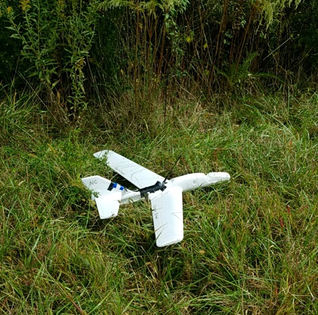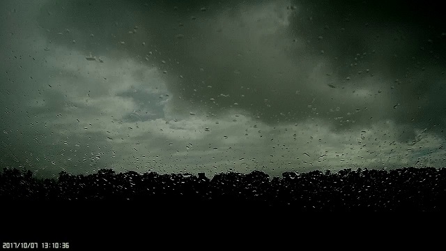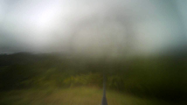 In the final minutes of the flight, the payload hovered above a storm cloud, riding the updraft. It eventually drifted around the edge of the updraft and entered the cloud. The view of cloud tops was replaced by a solid gray and the sound of strong rain. A rain drop obscured much of the tiny lens on the tail camera, but a nice open landing area soon loomed out of the mist. It skidded to a stop in tall grass — a perfect, gentle landing.