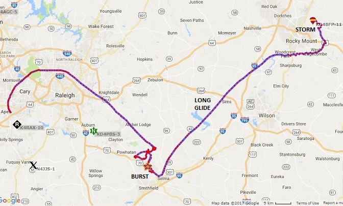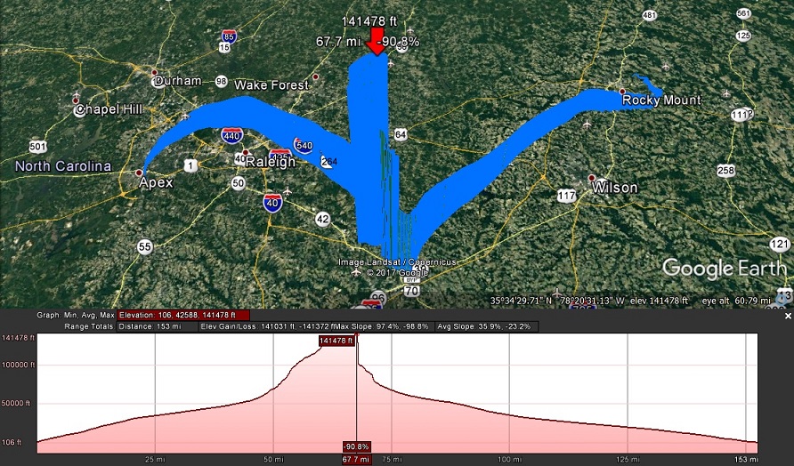 NSL-60 was flown on the morning of Oct 7, 2017. This was a re-flight of Paul L’s NSL-49 gear with a tweak to the cameras. The foam glider from NSL-49 was loaded with an AP510 tracker and 4200mAh LiPo. Again, this was just a simple $10 toy glider with no flight controls; subject to the winds like a parachute. The cameras were swapped, so that this time the Mate808 camera was embedded into the rear stabilizer of the plane — looking forward. It was connected to the same big LiPo as the tracker. The 808 #16 Lens B camera was mounted inside of the craft, pointing out a hole in the bottom. This camera was set to take still photos and was powered by its own small 1000mAh LiPo. All these parts were secured with toothpick struts and copious amounts of black electrical tape (to absorb solar heating). The entire craft and its 3m tow line came to 350g. It was hauled up with a 1600g cell with 900g of lift.