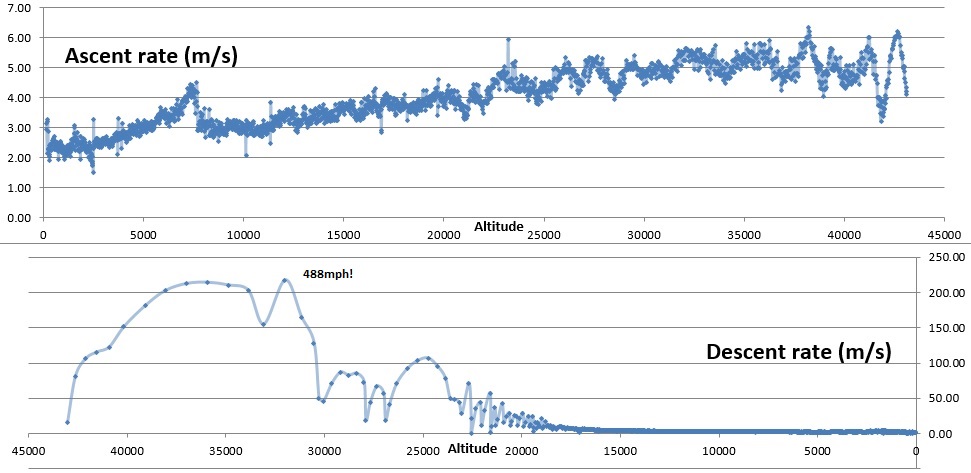 Strong gravity waves seen above 35km, and the fastest “re-entry” to date. Battery voltage got disconcertingly low during the cold glide back.