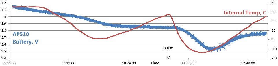 Paul was feeling as gloomy as the approaching weather as the APRS telemetry told of an on-board temperature of -13C and a battery voltage falling to 3.5V. But, then the temperature started to slowly rise! Over the second hour of descent, the temperature increased almost 40C and the voltage returned to 3.75V.
