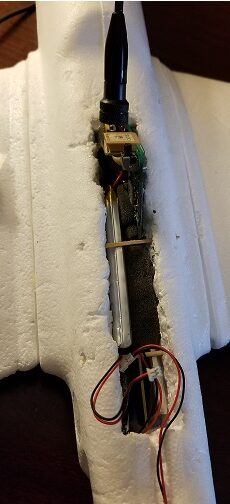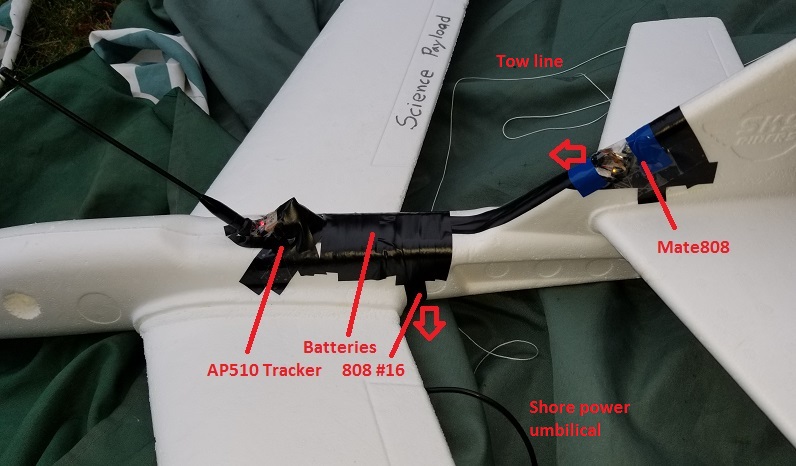 The hope was that the very low current draw on the Mate808 would allow it to operate throughout the flight and video the burst, glide, and landing. To give the tracker/camera every bit of energy that it could hold, a power umbilical (cell phone charger battery pack) was plugged in until seconds before launch.