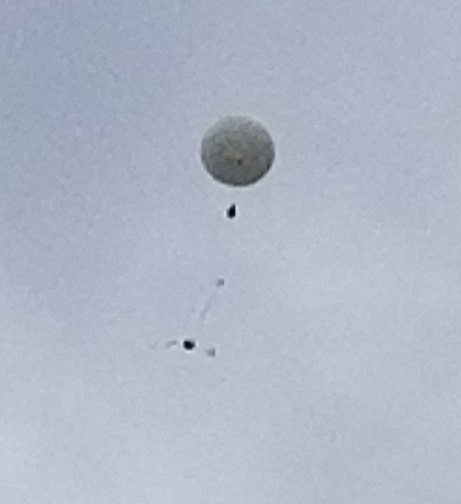 This flight had been advertised to the student body and was performed at the end of day. Students waiting for car pool witnessed the inflation and launch. It was rather breezy at the time, but thankfully this did not affect events — Perhaps a bit more lifting gas was added then desired, but it is hard to measure buoyancy in a breeze.