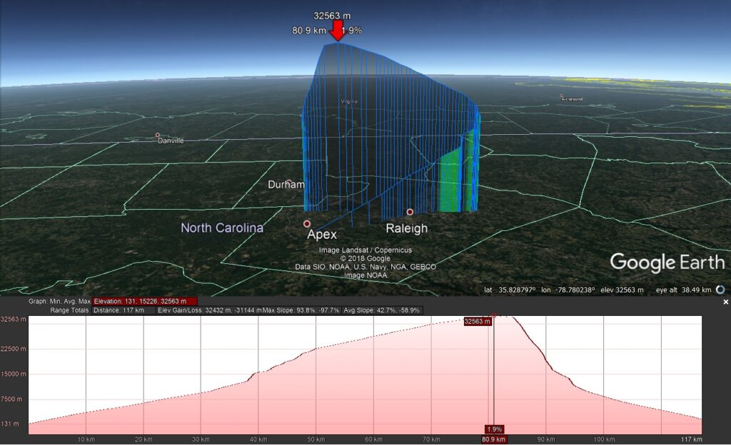 SpaceX had a several hour launch window to operate within. As Monday evening progressed, the STP-2 launch time slipped from Mon 2330EDT to Tues 0230EDT. To synchronize NSL-74 with STP-2, Paul pushed his launch time to Tues 0120EDT. This pushed the estimated landing time from a reasonable 0030EDT to 0330EDT. During those three hours of delay, the predicted flight track moved closer to Raleigh and away from Falls Lake — that was nice.