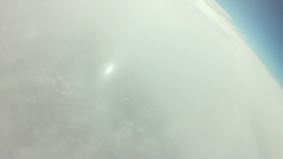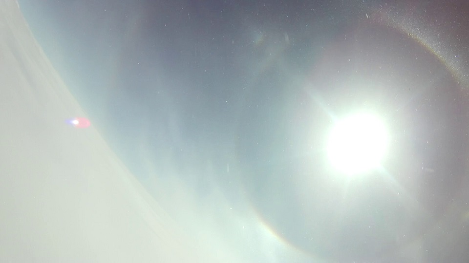 After breaking through these clouds, the cameras were greeted by a beautiful solar halo and sundogs. All cameras also recorded some sort of subparhelic bright spot. This was too far from the sun to be a “dog”, but too close to be a “glory”.