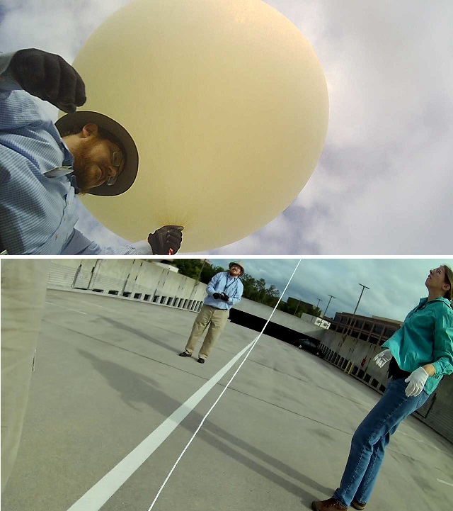 The weather up to this point had been wonderful. No rain and only occasional wind gust from the nearby hurricane. Just as the team reached the top of the parking deck, a strong sustained gust arrived. Chris held-on as the big balloon tried to wrench itself free in the wind. After what seemed like minutes, the gust subsided enough to allow launch.