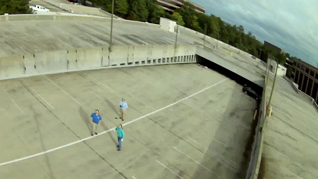 Just before balloon fill, it was decided that the flight could use another camera. But how? The payload box from Flight A was quickly cannibalized. The faulty low-light camera was torn-off, the AP510 removed, and the parachute snipped. The remaining plastic box held just a Mobius Mini camera and was quickly tied on to Flight B, hanging about 3m below. The balloon fill then proceeded normally. With everything ready, the team then walked the gear to the top of the parking deck.