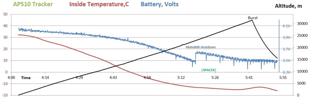 Flight data from AP510 tracker and INSIDE TMP36 sensor.  All data recorded on AP510 SD card.  Note shutdown of Mate808 seen in battery voltage moments before SpaceX launch.