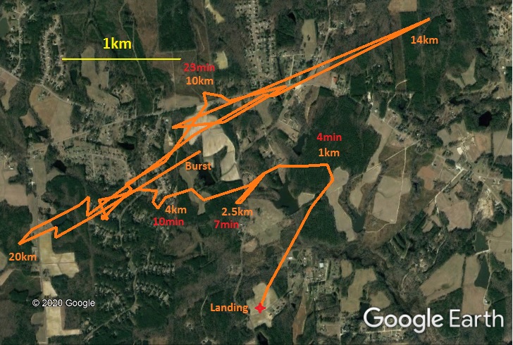 The on-board landing prediction software worked rather well.  It’s guesses during descent were within a couple kilometers of the actual landing site.  The map above shows the path of the guesses as the flight descended.  Noted are the approx altitudes where the guesses were made and their associated number of minutes before touchdown.   The prediction used data collected during ascent over two hours prior.  It also landed in an area that was lower than the launch site.