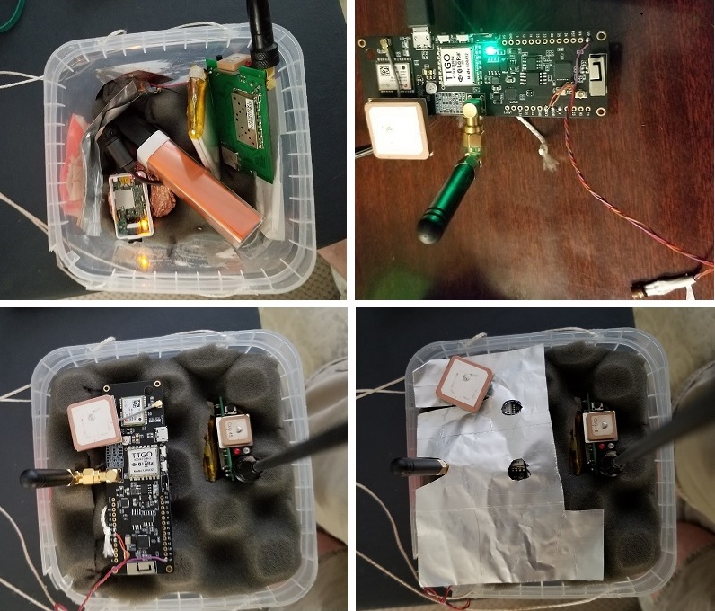 The GPS antennas were shielded from the noisy cameras with several foil layers.  A final foil layer shielded the T-Beam GPS from its processor board. The whole payload came to 500g.