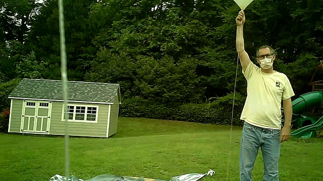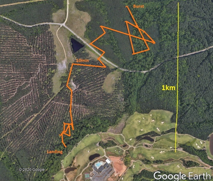 NSL-83 launched the morning of June 20, 2020.  The intent — to test three separate trackers and give Christopher R. an opportunity to construct his own payload.  Tim W. and Paul L. met up at Chris’ home and tied together payloads while keeping appropriate distances.  A 600g cell with 1500g of H2 lift was to carry a 90cm parachute and three payloads: