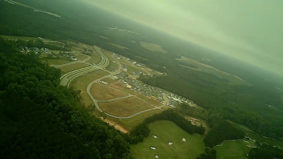 Thankfully the plot held and the payloads descended just southwest of the landfill.  The T-Beam’s predicted landing coordinates were transmitted to Paul’s chase car and then displayed on Habhub.   During descent this prediction danced around within 1km of the actual landing site.   It was headed for a neighborhood with a large sprawling golf course.  Three chase cars arrayed themselves there waiting.