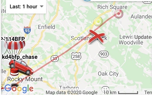 The two rocket launches were scheduled within 30 minutes of each other that evening — The Antares would launch from Wallops Island, Virginia; and Falcon 9 from Florida (with a drone ship landing off the coast of NC). With a somewhat strong jet steam in the area, Paul chose a long flight path from Aberdeen to Rocky Mount, NC. An old Kaymont 600g cell, loaded with whatever H2 remained in the tank (expected 1400L or 50cu ft); should work to image both flights. Chris G. volunteered to be Public Address Officer.