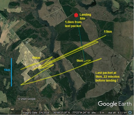 Paul eventually reached the projected landing area. With fingers crossed, he slowly drove the country roads with the receiver’s Yagi antenna hanging out the car window. After a few moments, the software’s received signal strength meter showed something on a nearby frequency. Paul pulled over beside an open field and adjusted receive frequency — a clean packet came through. That was enough to identify the true landing location — a mere 1.6km from the guess made much earlier in the flight.