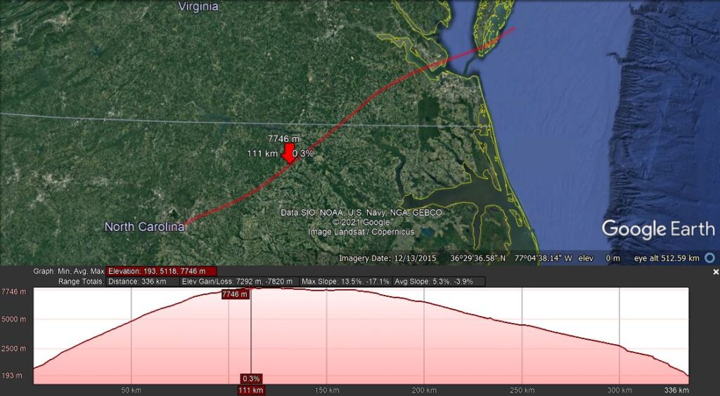 After several hours, the cell made it to 7746m (25,413ft, 362hPa) before it failed.  This led to a slow descent into the Atlantic off of Virginia.