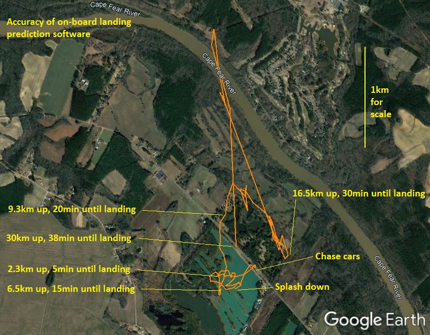 The predicted landing site repeatedly recalculated and plotted during descent, never straying more than about 2km from a location near the Cape Fear river. Twenty minutes before landing, this prediction converged upon a nearby pond — oh no!