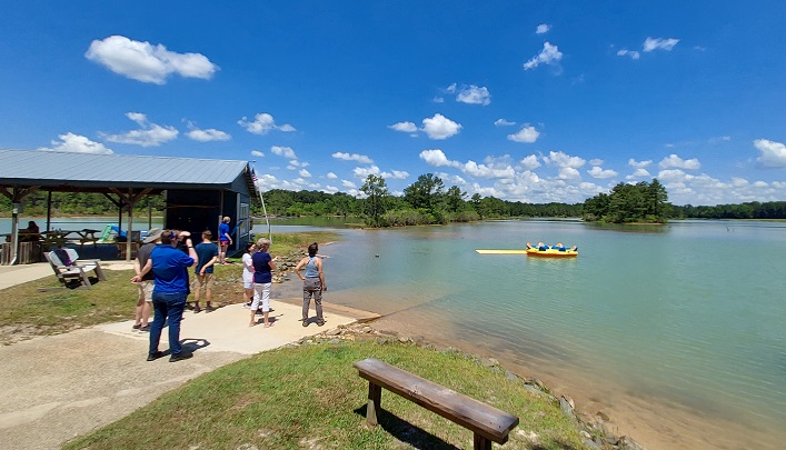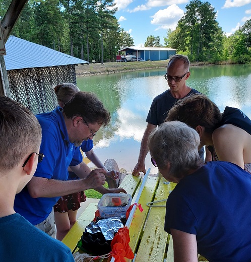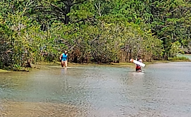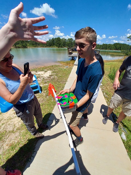 The pond was too shallow near the payload for the ski boats, so the instructors opted to simply swim/walk out to the payload and carry it back. The chase crew waited at the boat ramp.