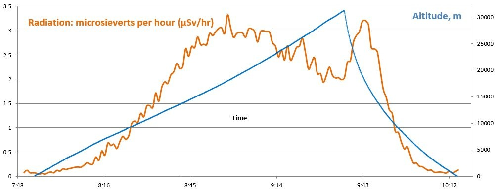 Radiation data. Note the Pfotzer Maximum (high radiation regime from 10-25km)